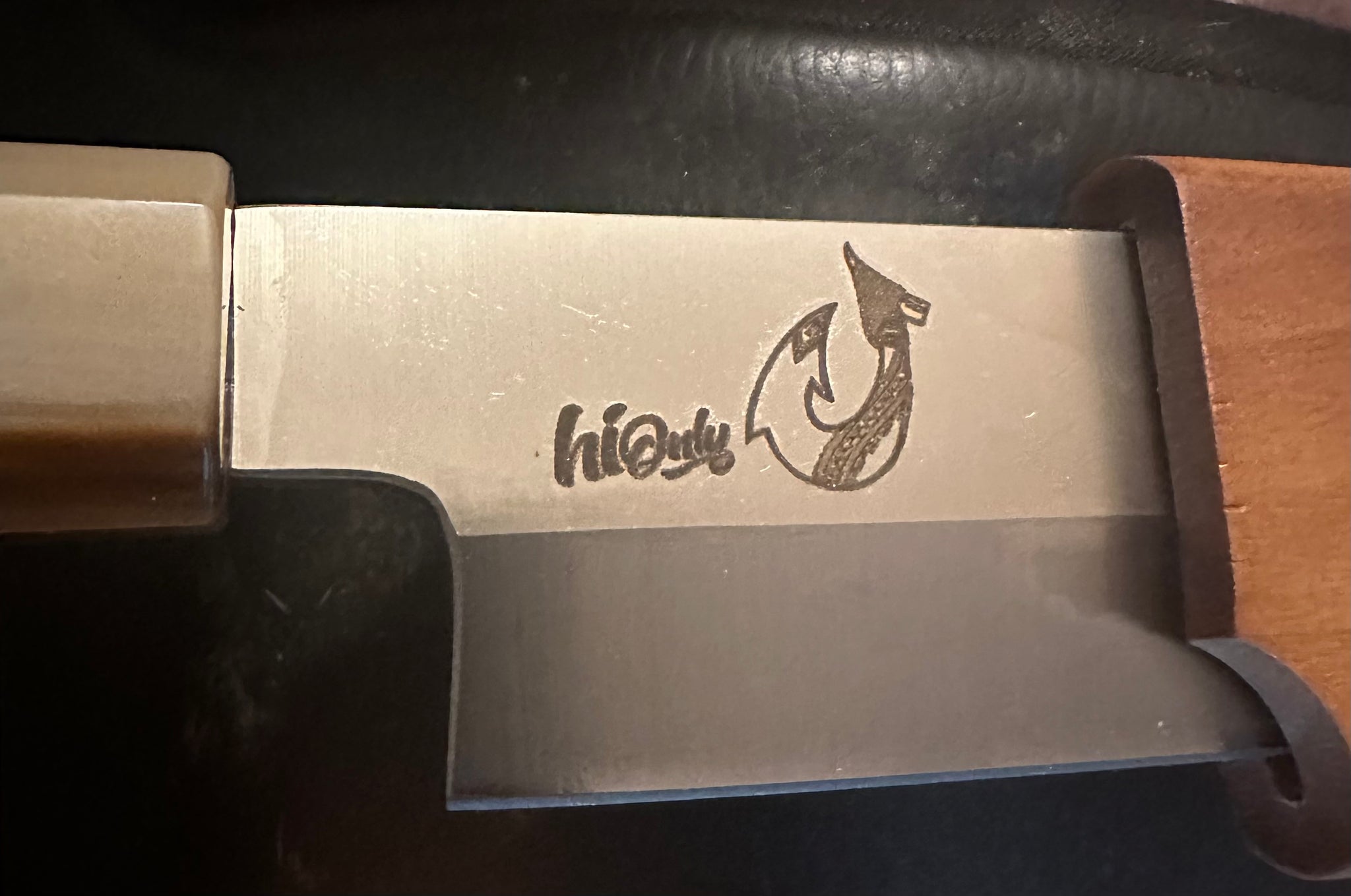 Japanese style single bevel blade with custom resin handle and Hawaiian Hook art done by Kanaka Maoli artist tattoos by jarrett.
