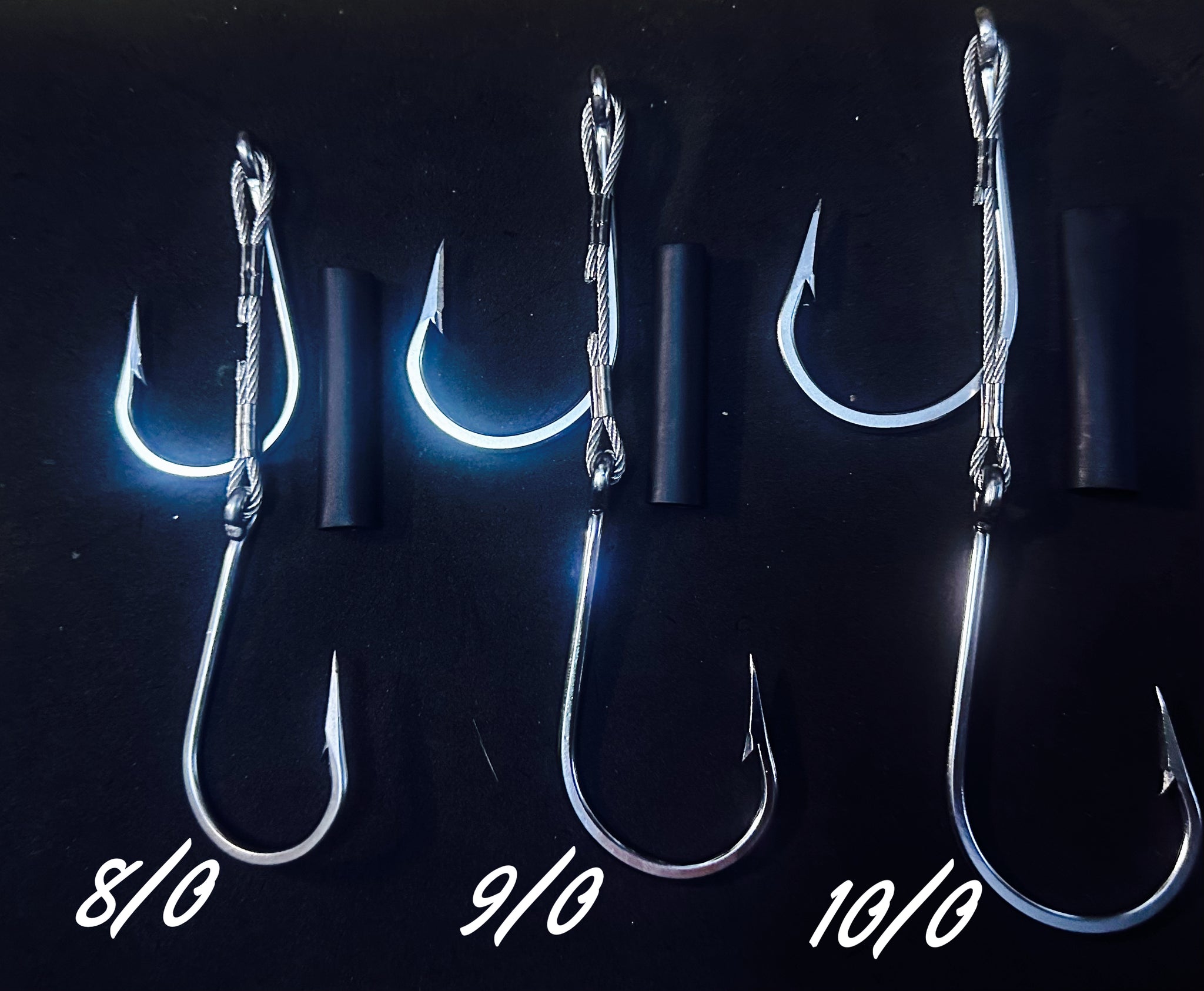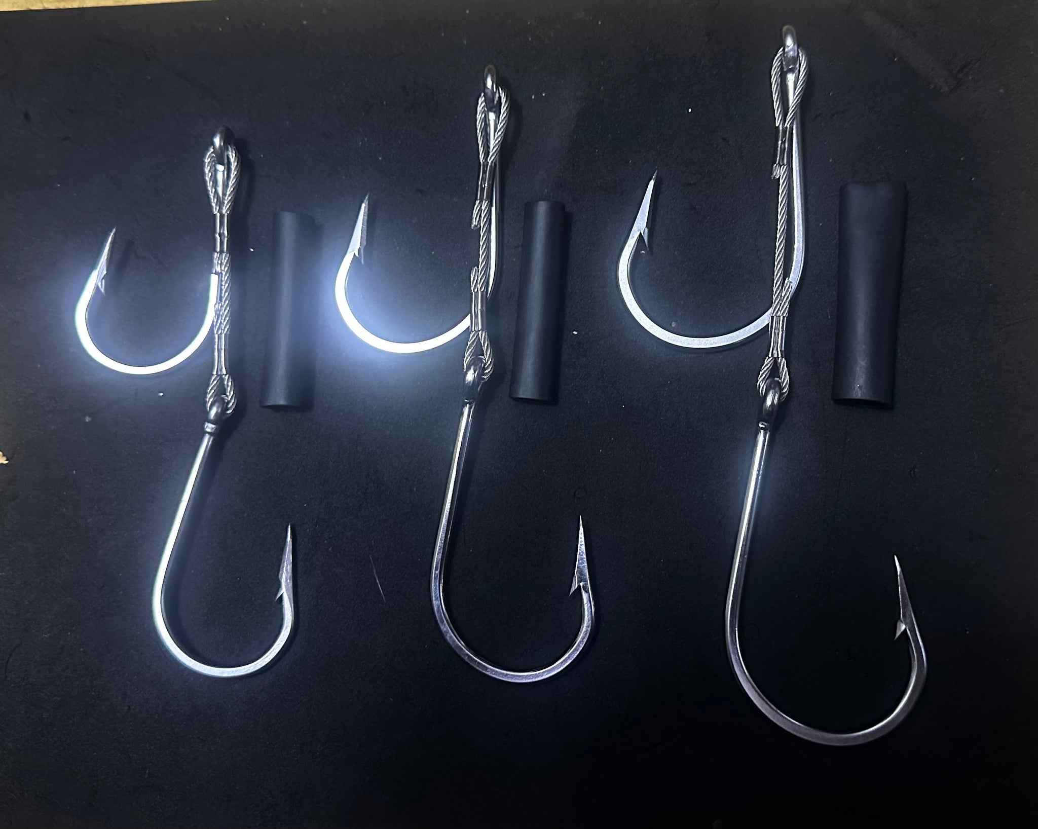 Mustad style quality hook rigs in 300# wire tandem 8/0, 9/0 and 10/0..
